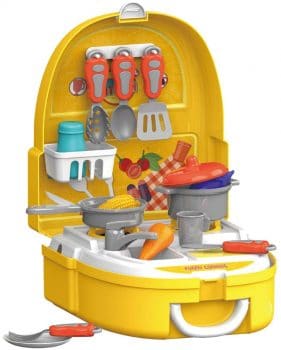 Quer um modelo mais compacto? Aqui, tem! A marca Replay Kids tem um que parece uma pequena maleta ou lancheira. Ao abrir, o pimpolho vai se deparar com tudo o que precisa para preparar uma deliciosa refeição: fogão de duas bocas, uma piazinha, panela, frigideira e talheres para mexer a comida, e alguns alimentos de plástico, como milho, cenoura e beringela.