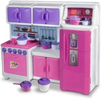A Cotiplas tem um modelo lindo que sai água de verdade na pia! O brinquedo tem um design diferenciado, com fogão, forno, pia, geladeira, porta-talher e talheres, pratos, frigideira, panela com tampa e copo.