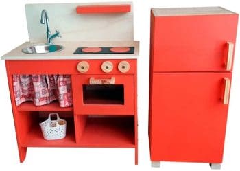 Para sair um pouco das cozinhas tradicionalmente feitas em material plástico, a Kit e Gifts Brinquedos lançou no mercado o modelo Mundo Cereja, construído em madeira. Além da geladeira, que fica separada dos demais itens, tem pia, fogão, cortina para cobrir o compartimento que fica logo abaixo da cuba, forno e dois compartimentos para guardar os utensílios domésticos.