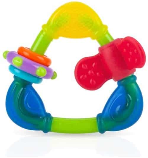 O mordedor triângulo da Nuby também faz a alegria dos babies, já que enquanto morde, o chocalho balança e é festa na certa. Este mordedor também tem a estrutura em alto relevo, o que alivia a coceira e o desconforto da gengiva do bebê.
