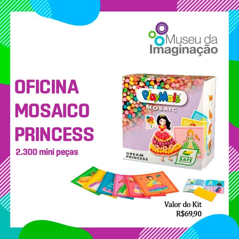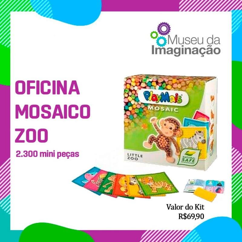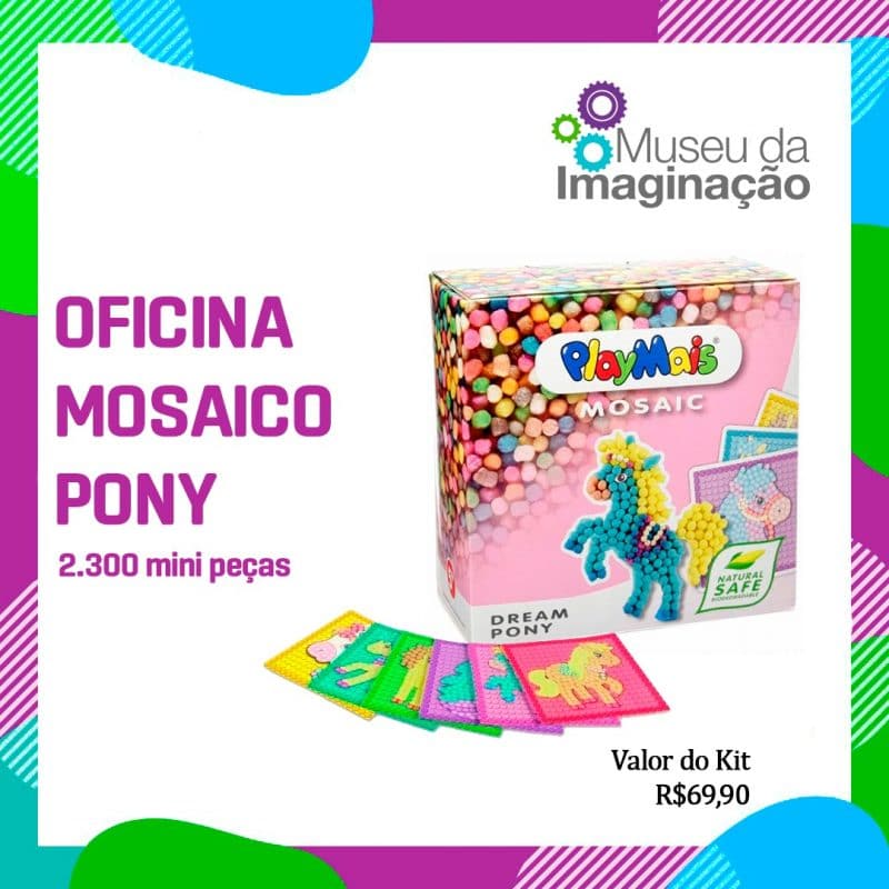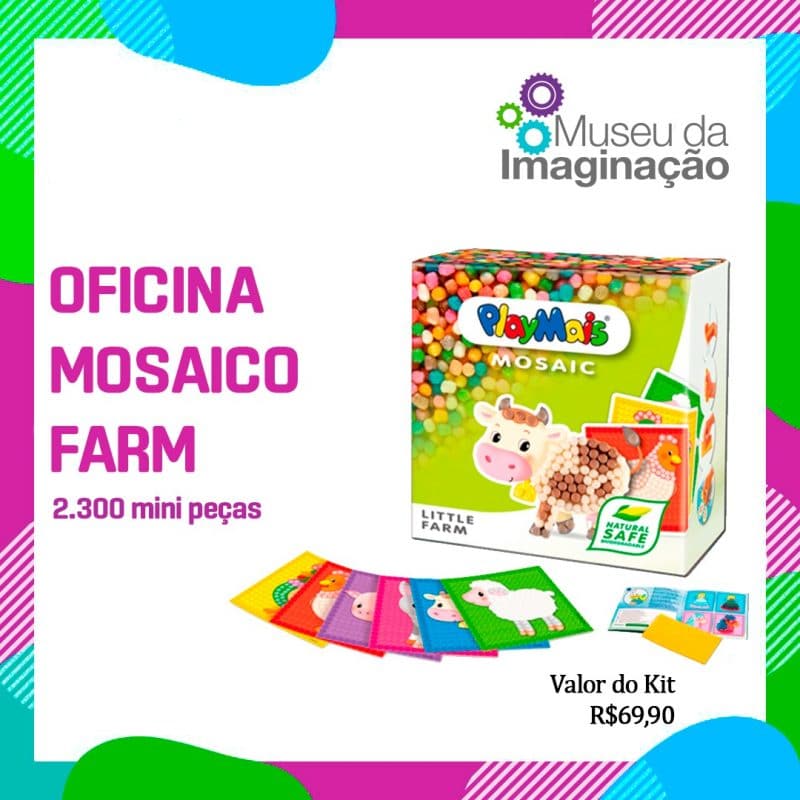 Aqui a gente revive a arte do mosaico, que é uma arte milenar. O mosaico pode ser feito de pedras, de cerâmica, de vidro; na oficina será utilizado sêmola de milho orgânico, água e corante alimentício. O produto PlayMais é um brinquedo pra modelar, não tóxico e 100% sustentável. São quatro tipos de kit pra escolher: