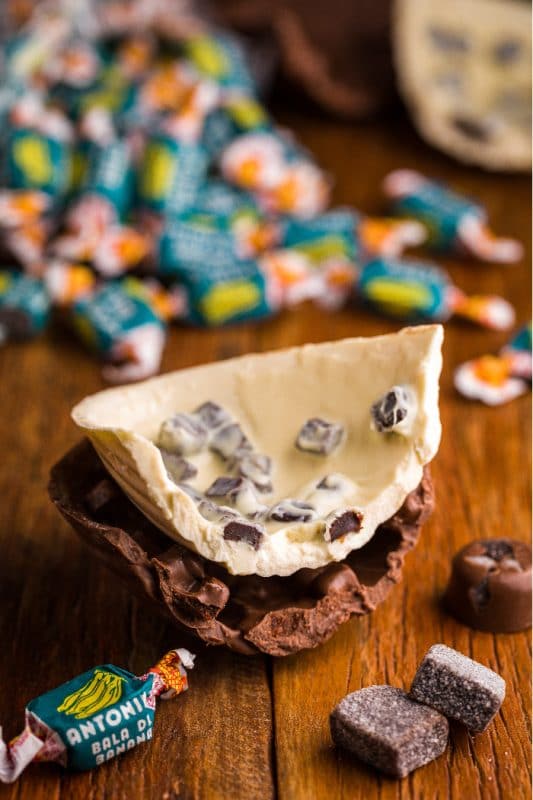 OVO DE CHOCOLATE AO LEITE E BRANCO COM PEDAÇOS DE BALA DE BANANA ANTONINA