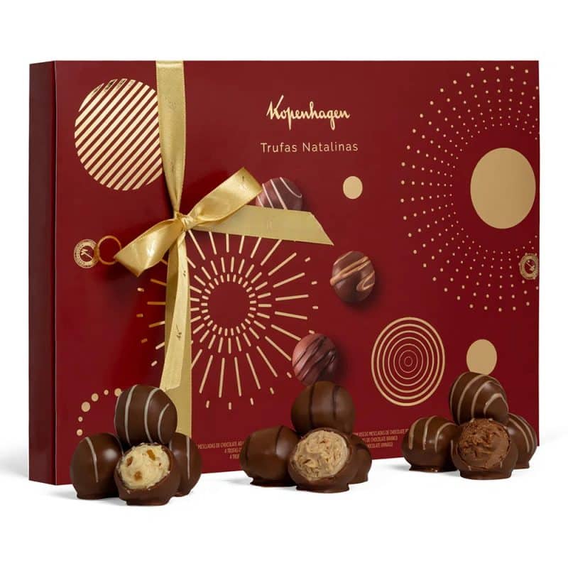 Já a Caixa Trufas Natalinas (R$ 69,90) foge do convencional e traz 12 trufas com sabores diversificados, que agradam ao paladar de qualquer um. São quatro trufas mescladas de chocolate ao leite e chocolate branco, cobertas com chocolate ao leite e decoradas com chocolate ao leite e chocolate branco por cima.