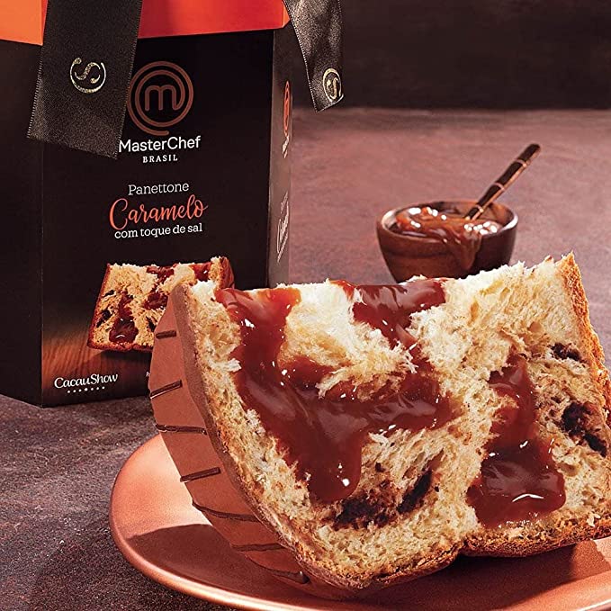Panetone delicioso com gotas de chocolate ao leite, recheio sabor caramelo com toque de sal, decorado com chocolate ao leite e chocolate 55% de cacau....