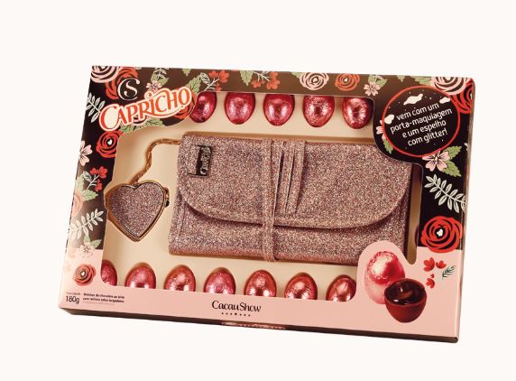 Outra tradição da Cacau Show é o Kit Capricho, que este ano ganhou uma nova versão, que promete cair no gosto das adolescentes. Junto com os deliciosos ovinhos de chocolate ao leite com recheio sabor brigadeiro, está um charmoso porta-make com espelho, que dá para levar a qualquer lugar. Disponível nas cores rosa ou preta. A partir de R$59,90.