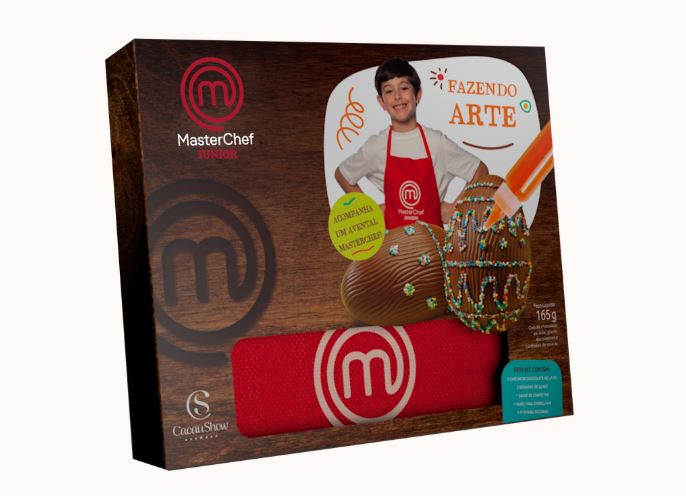 Para a garotada que gosta de se aventurar na cozinha, a Cacau Show traz o Kit MasterChef Júnior. Junto com o saboroso ovo de chocolate ao leite, seguem bisnagas de glacê e miçangas para decorar o ovo como os pequenos quiserem. Para entrar no clima, o kit também conta com um avental MasterChef Júnior. A partir de R$39,90.