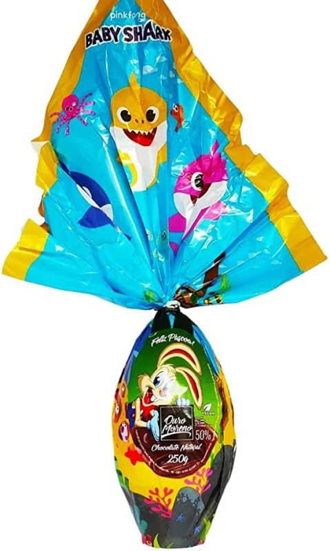 Ovo de Páscoa Infantil Sem Leite Baby Shark Ouro Moreno 250g Vegano. Kosher Chocolate 50% cacau. Feito com apenas 3 ingredientes INGREDIENTES Açúcar c...