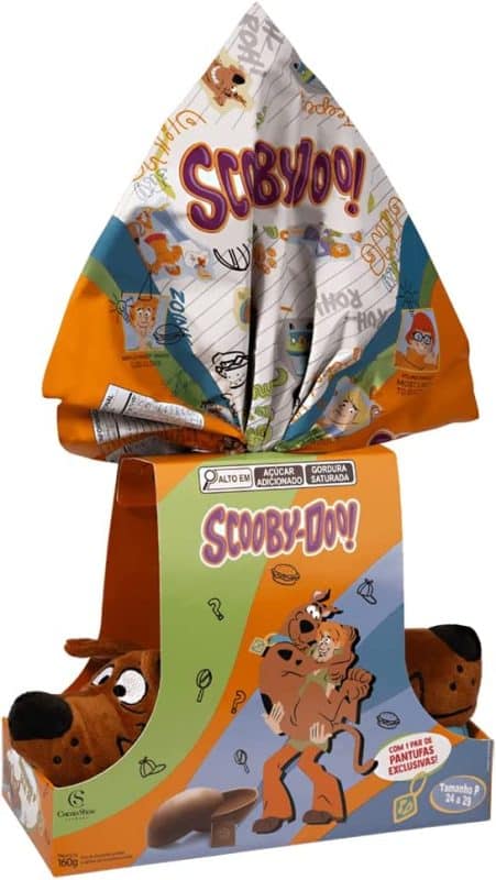 Ovo de chocolate ao leite. Acompanha um par de pantufas do personagem Scooby-Doo. Tamanho P calça do tamanho 26 ao 29. Divirta-se com o seu personagem...