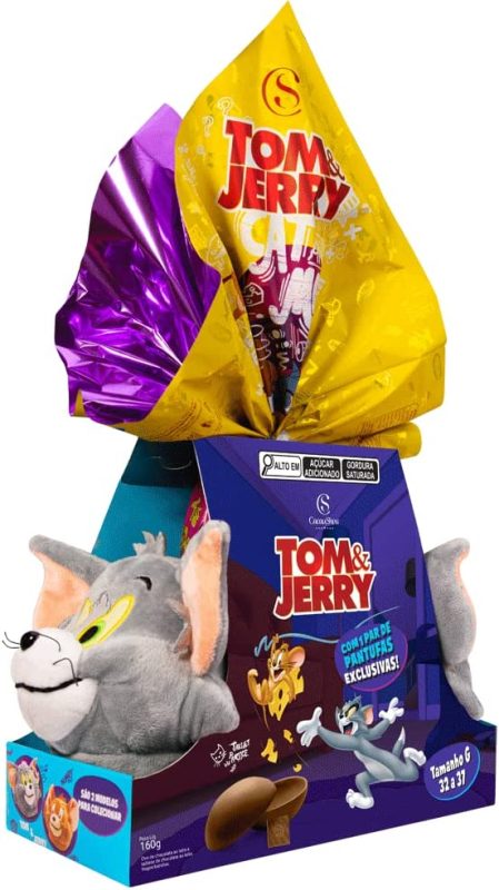 Ovo de chocolate ao leite. Acompanha um par de pantufas do personagem Tom. Tamanho G calça do tamanho 32 ao 37. Divirta-se com o seu personagem favori...