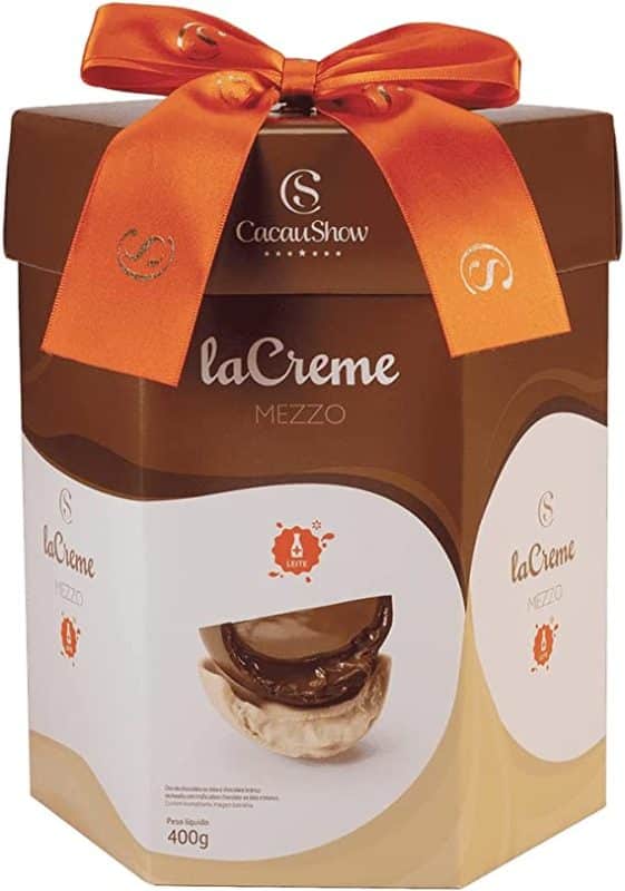 Meia casca de chocolate ao leite laCreme recheada com trufa de chocolate ao leite e meia casca de chocolate branco laCreme e recheada com trufa de cho...