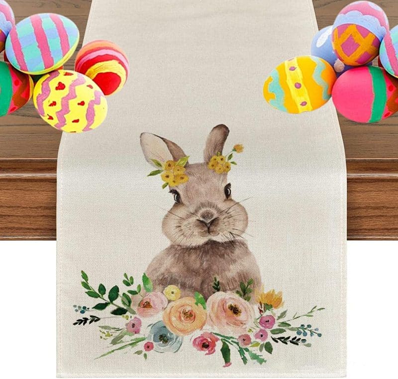 [Crie atmosfera para a primavera] Criando uma atmosfera aconchegante de Páscoa para festas, o caminho de mesa de Páscoa é projetado com ovos de Páscoa...