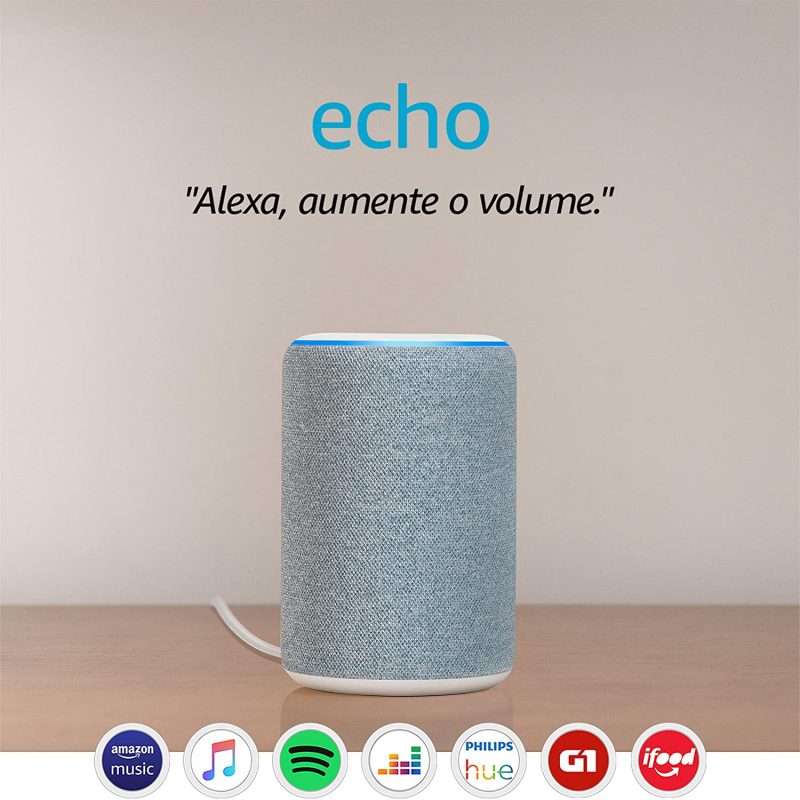 Febre do momento, a caixa de som Echo – 3ª geração – Smart Speaker, com tecnologia Alexa integrada. Possui também controle de música por voz, auto-falantes com tecnologia Dolby. Controle de voz para acender as luzes de casa, trancar as portas, entre outros dispositivos que tenham tecnologia compatível com o aparelho.