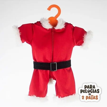 Essa é uma opção de uniforme de Natal para os amiguinhos de quatro patas. Possui um cinto preto e detalhe de pluminhas nas barras das patas e touca....