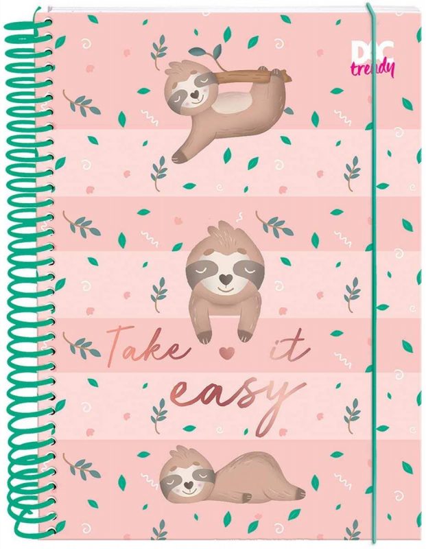 O modelo da DAC, Preguiça Trendy, também com 10 matérias e 160 folhas, conta com espiral em plástico verde, capa dura, desenho envernizado e elástico para manter o caderno fechado.