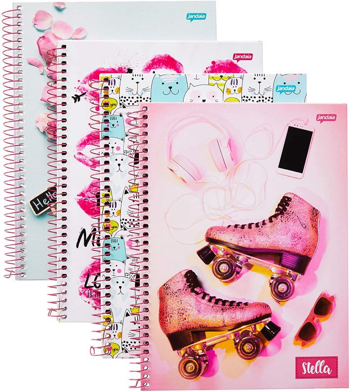Já quem prefere comprar logo um kit para várias matérias, a dica é o pacote da Jandaia, modelo Stella, que vem com quatro cadernos de uma matéria (80 páginas), capa dura e ilustrações variadas.