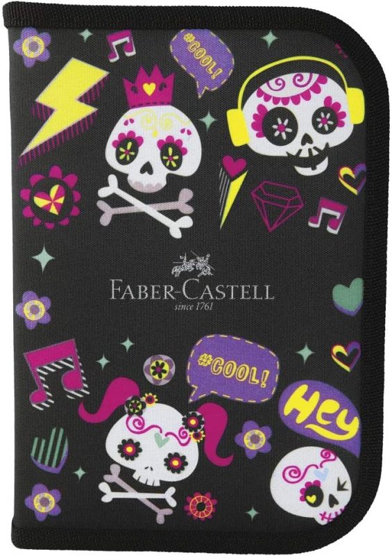 Uma opção mais “Rock’N’Roll” é o estojo modelo Caveirinhas, da Faber-Castell. Sua área interna tem organizador de lápis, caneta esferográfica, régua de 15cm, apontador com depósito e borracha. São três opções de cores, com as caveirinhas presentes em todos eles.