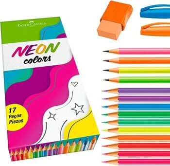 São 17 itens para desenhar, escrever e marcar. O Kit conta com: Trilux Colors Laranja e Azul, EcoLápis Grafite Neon, EcoLápis de cor neon e Borracha FCMax.