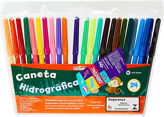 Hidrocor 24 cores Corpo na cor da tinta e Formato redondo. Traço de 1mm e Tampa anti-asfixiante. Atóxico. Carga de 0.8g.