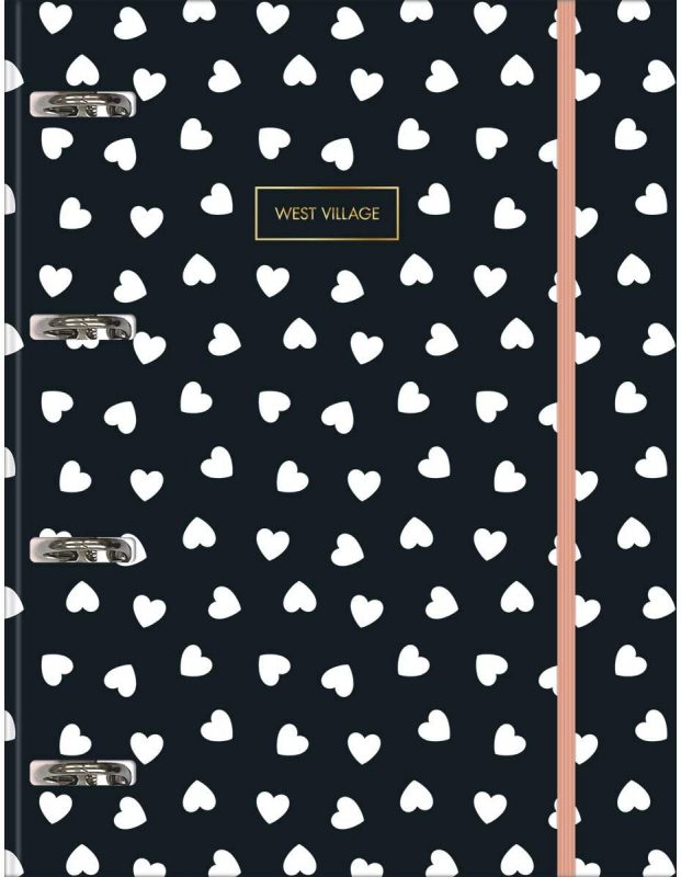 O modelo West Village, da Tilibra, é uma boa opção para quem gosta de uma estampa mais delicada. Este, aliás, é coberto de coraçõezinhos na capa, tem a parte interna decorada com adesivos sortidos e bolsa plástica para guardar documentos.