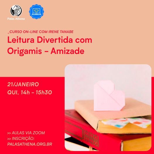 Os pequenos que gostam de origami podem participar de uma leitura divertida no próximo dia 21 (quinta-feira), das 14h às 15h30. Com base em livros infantojuvenis com a temática da amizade, Irene Tanabe vai dobrar, junto com as crianças via Zoom, alguns origamis que representam partes das histórias, personagens e objetos. Com muita poesia, brincadeira e relatos, a oficina pretende sensibilizar adultos e crianças para a literatura. As famílias podem fazer juntas! A oficina é indicada para crianças a partir de 6 anos.