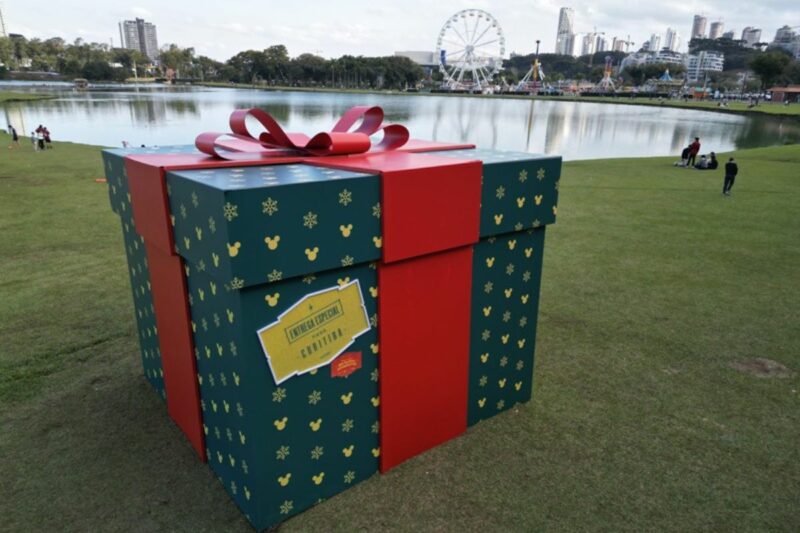 A chegada da Disney à cidade foi anunciada com uma ação simbólica: uma caixa de presente gigante, com a inscrição “Entrega especial para Curitiba”, foi instalada no Parque Barigui, chamando a atenção de moradores e turistas. A peça já se tornou um dos pontos mais fotografados da capital paranaense neste inverno.