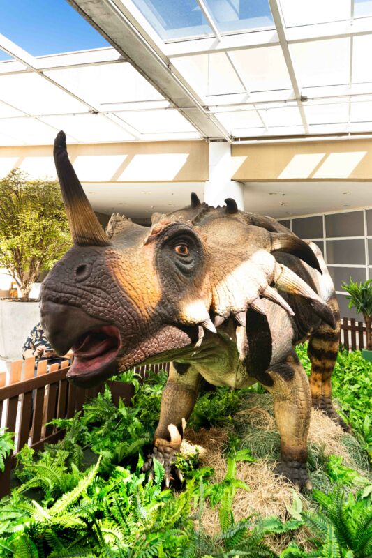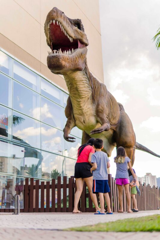 Além desses, espécies como Braquiossauro, Velociraptor e até réplicas de ovos de dinossauro estão espalhadas pelo shopping, oferecendo uma aventura educativa e divertida para todas as idades.