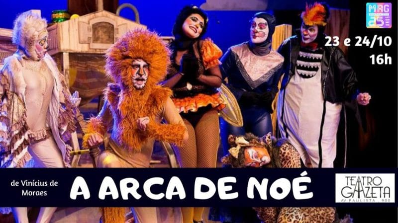 Um bom programa para fazer com as crianças é assistir o espetáculo infantil “A Arca de Noé”, inspirado nas canções de Vinícius de Moraes e Toquinho, que estará em cartaz nos dias 23 e 24 de outubro, sábado e domingo, às 16h, no Teatro Gazeta. Com 60 minutos de duração, a peça encanta crianças e adultos e tem classificação livre. Os ingressos custam R$80 (inteira) e R$40 (meia-entrada). Crianças até 3 anos não pagam. O teatro está trabalhando com apenas 80% da capacidade e medidas de distanciamento social.