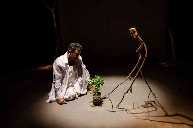 A montagem utiliza o teatro de sombras para criar uma atmosfera que se alterna entre encantadora, soturna e vertiginosa, os personagens são representados de forma simples, com bonecos feitos de galhos e folhas.