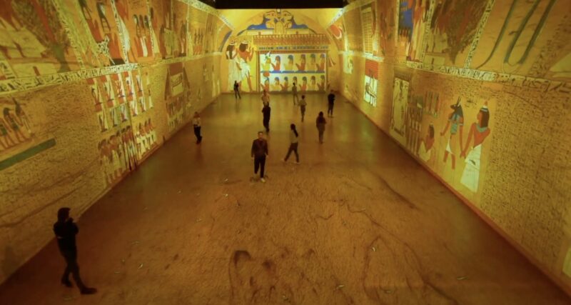 Uma projeção imersiva de 4K transforma a sala em um portal temporal com cores vibrantes, narrativas cativantes e a majestade da tumba de Tutankamon.