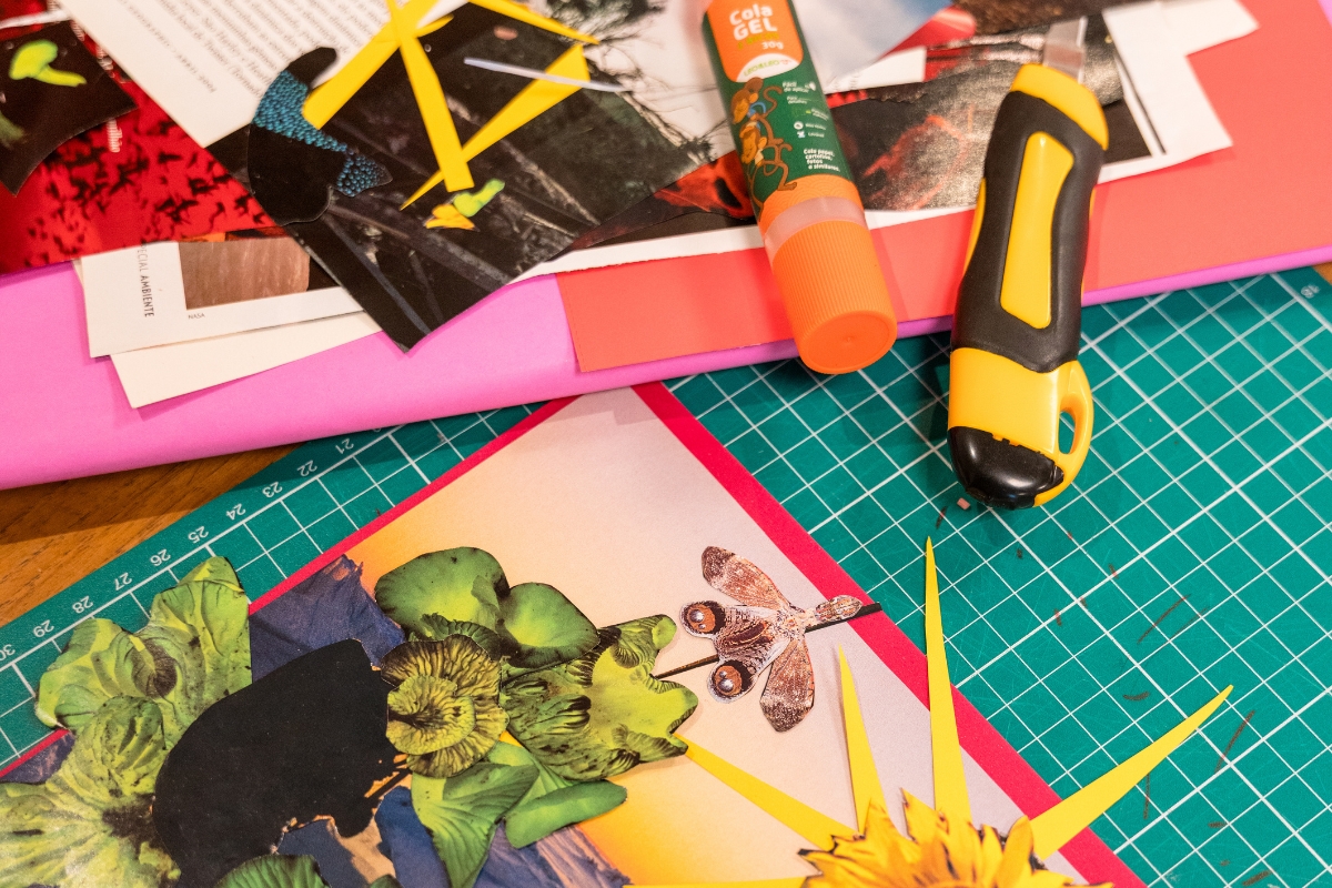 Os participantes são convidados a trabalhar com revistas e outros materiais gráficos na criação de corpos híbridos — composições em que partes do corpo são substituídas por elementos da natureza, como galhos, raízes e folhagens. A proposta investiga visualmente a fusão entre corpo e a natureza, estimulando a imaginação e a experimentação de novas possibilidades de composição.