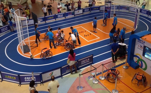 O espaço traz um circuito cenográfico de 120 m² que simula uma arena paralímpica de verdade. Monitores estão disponíveis para ajudar o público em cinco modalidades esportivas: