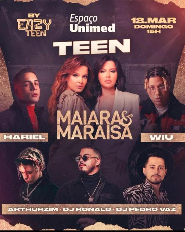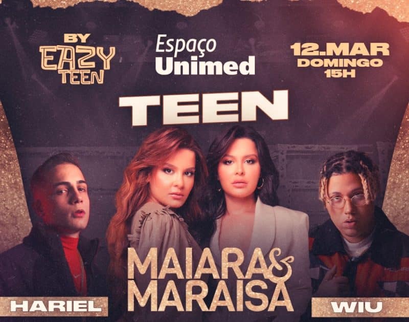 [EXCLUSIVO!] A boa e velha matinê está de volta e em grande estilo: com show da dupla sertaneja Maiara e Maraisa, entre outros, que farão o lançamento do “Eazy Teen”, evento exclusivo do Espaço Unimed para público adolescente, que acontecerá aos domingos, à tarde, e só podem entrar no evento jovens de 12 a 17 anos.