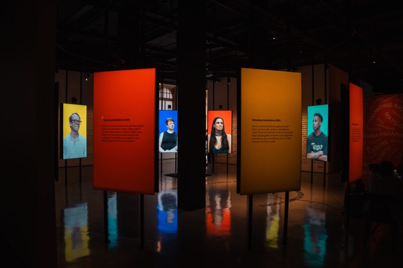 Inaugurado em 2006 e reconstruído após o incêndio de 2015, o Museu da Língua Portuguesa apresenta exposições que unem cultura, história, tecnologia e emoção para mostrar a língua portuguesa como patrimônio imaterial em constante transformação. A exposição “Falares”, no terceiro andar, serviu como inspiração para a nova mostra temporária, reunindo depoimentos de brasileiros de diversas origens sobre sua relação com a fala.