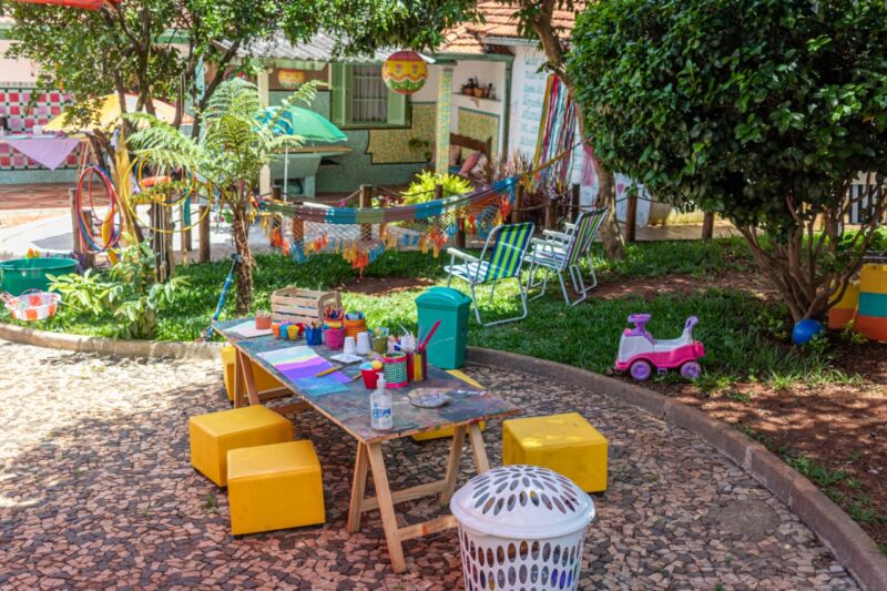 Ao entrar no local, as crianças são recebidas por uma casa de brincar, equipada com hortinha, redes, brinquedos de diversos tipos, materiais para pintura e desenho, cabana, balanço, bambolê e muito mais. Cada detalhe é pensado para criar um ambiente propício ao livre brincar, ressignificando a infância e incentivando a imaginação.