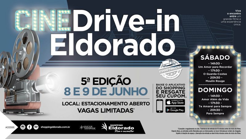 Mamãe e papai também merecem um passeio! E o Shopping Eldorado recebe uma atração cheia de romantismo para comemorar o Dia dos Namorados. Nos dias 8 e 9 de junho, sábado e domingo, o estacionamento do shopping recebe o 5º Cine Drive-In, com participação gratuita.