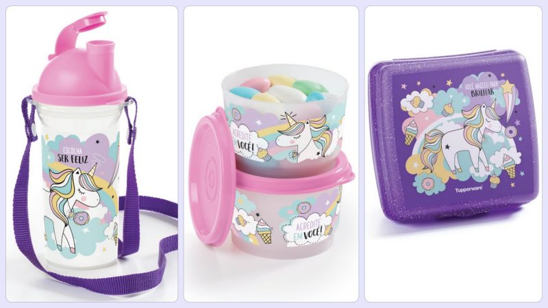 Unicórnio é trend. É top. É lindo. E aí a gente vê uma novidade dessa…e quase vomita arco-iris! A Tupperware lançou hoje uma linha linda estampada com unicórnios! São três itens: Copo com Bico e Alça, Porta Sanduíche e Potinho com estampas fofíssimas de unicórnios!