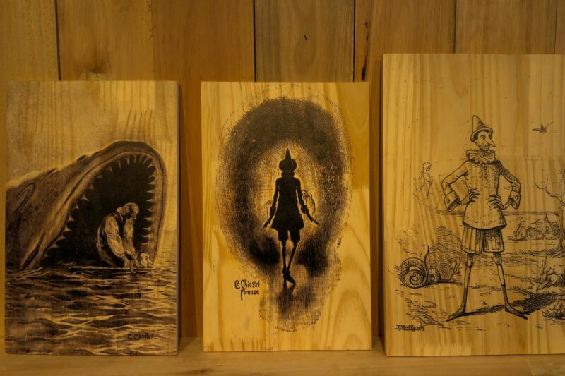 Entre os destaques estão esculturas em madeira do artista cearense Zé Bezerra, ilustrações de Alex Cerveny para uma edição publicada em 2012 e gravuras do artista norte-americano Jim Dine. O percurso inclui ainda uma sala dedicada à passagem do tubarão-baleia, com obras de Lorenzo Mattotti, e termina em um ambiente imersivo que combina projeções digitais e trechos do livro de Collodi, em diálogo com cenas do filme I.A. – Inteligência Artificial, de Steven Spielberg.