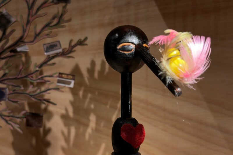 Neste mesmo piso, a chamada “Oficina de Criação” reúne marionetes em madeira produzidas pelo artista brasileiro Gil Toledo, além de uma biblioteca dedicada às traduções brasileiras de Pinóquio. Uma instalação de Adriana Peliano estabelece diálogo com personagens criados por Monteiro Lobato, ampliando a conexão do clássico com a literatura nacional.