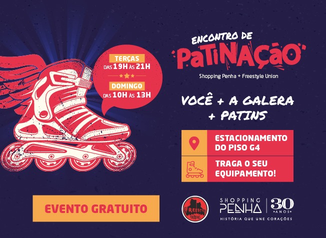 Se você tem crianças em casa que gostam de patinar, aproveita para ir junto e gastar energia nos encontros promovidos pelo pessoal da “Freestyle Union” no Estacionamento Piso G4, aos domingos das 10h às 13h e às terças, das 19h às 21h. É a Pista de Patinação Roller, do Shopping Penha.