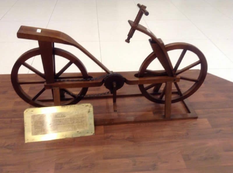 Você sabia que é atribuído à Da Vinci o primeiro projeto do que veio a ser uma bicicleta? Ele desenhou o veículo em 1490 e a exposição traz esta escultura em uma réplica em madeira com pedais ligados por um cinto de couro.