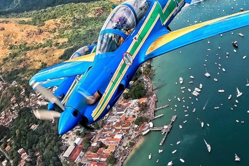 A apresentação da Esquadrilha da Fumaça é um show de técnica, disciplina e emoção. Sete aeronaves A-29 Super Tucano cruzam os céus em formação, soltando fumaça branca e colorida que desenha o céu com manobras coreografadas.