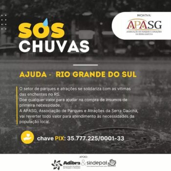 O Sistema Integrado de Parques e Atrações Turísticas (SINDEPAT) e a Associação Brasileira de Parques e Atrações (ADIBRA) estão lançando uma campanha conjunta de solidariedade para ajudar as vítimas das enchentes no Rio Grande do Sul. A mobilização visa arrecadar doações que serão direcionadas à Associação de Parques e Atrações da Serra Gaúcha (APASG), entidade local que coordenará a distribuição dos recursos conforme as demandas emergenciais.
