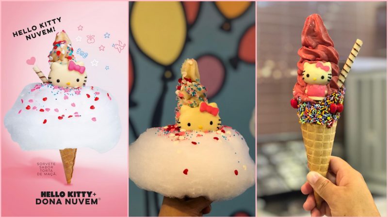 A novidade é fruto da parceria entre a Sanrio, detentora da marca Hello Kitty, e a Dona Nuvem, uma sorveteria super diferente e fofa, que serve sorvetes com algodão doce super criativos (e que rendem as fotos mais lindas para o Instagram). Em comemoração aos 45 anos da Hello Kitty, essa parceria promete muitas novidades ainda esse ano.