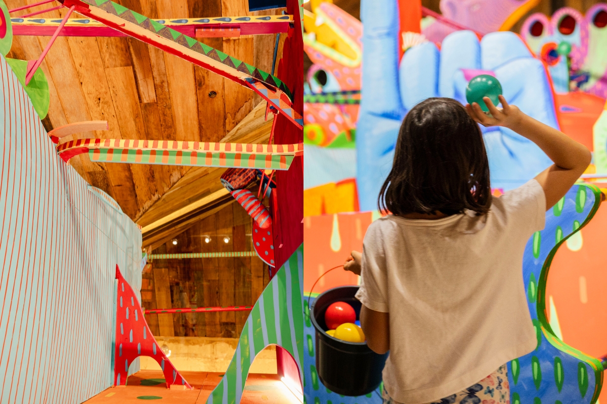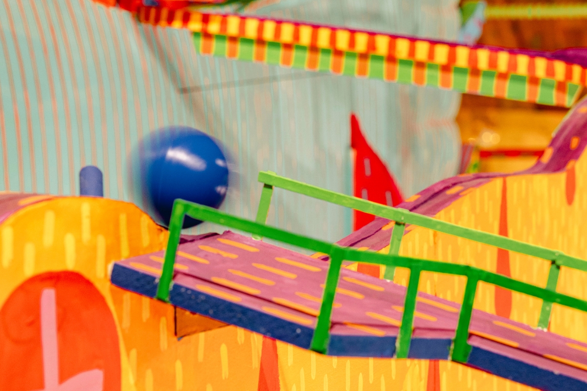 No centro da sala, uma grande instalação site-specific se ergue como uma espécie de ilha formada por camadas de personagens, painéis de madeira e estruturas compostas por tubos e canos, criando um circuito que se revela aos poucos, à medida que o corpo circula, observa e interage. A experiência começa com um gesto simples: lançar bolinhas em pontos específicos da obra. A partir daí, tudo se transforma.
